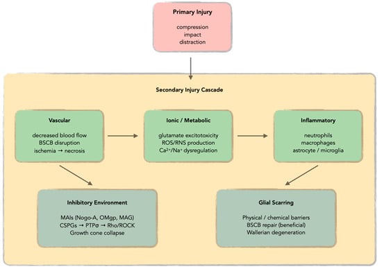 The pathophysiology of SCI involves a complex biphasic process consisting of primary and secondary injury mechanisms (Figure 1) [9,10,11,12,13,14]. Primary injury occurs through various mechanical forces, including compression, impact, distraction, and laceration/transection, which directly damage neurons, glial cells, and the neurovasculature of the spinal cord [9,10,11,12]. The extent and level of primary injury largely determine the severity and outcome of SCI [9,10,12]. However, it is the secondary injury cascade that represents the primary therapeutic target, as it evolves over hours to weeks following the initial trauma and significantly contributes to the final neurological deficit [9,10,11,12,13]. This secondary injury cascade encompasses multiple interconnected pathological processes, including vascular alterations, ionic disruption, metabolic dysfunction, neuroinflammation, creation of an inhibitory environment, and scar formation [9,10,11,12,13].