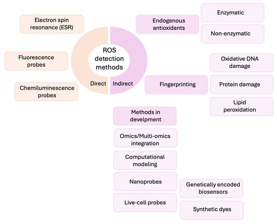 Newer methods such as live cell probes, genetically encoded biosensors, omics integration, computational modeling, nanotechnologies, and multiplex platforms have been reported as alternative platforms for ROS detection. Newer approaches offer complementary perspectives on oxidative processes at the molecular, cellular, and systems levels. These tools not only improve mechanistic understanding but also hold translational potential for disease diagnostics and therapeutic monitoring. Live-cell probes (small-molecule ROS-responsive fluorescent probes) are fluorescent molecular tools (either small synthetic dyes or genetically encoded sensors) that enable real-time monitoring of ROS dynamics in living cells under physiological conditions [28]. Small molecule fluorescent probes (e.g., DCFH-DA for general ROS, DHE for superoxide, mitoSOX for mitochondrial ROS) penetrate the cell, are oxidized by ROS, and generate fluorescent signals [29]. Genetically encoded probes, such as redox-sensitive GFP (roGFP), Grx1-roGFP2, and HyPer, change their fluorescence in response to oxidation and can be targeted to specific cellular compartments [30]. The advantages of such real-time monitoring are the observation of transient ROS bursts and redox changes over time within the same living cells, that high-resolution imaging allows for the identification of the precise cellular compartments (e.g., mitochondria) where oxidative events take place, and that the preservation of cell physiology avoids artifacts caused by destructive extraction methods (e.g., loss of compartment integrity, disruption of redox equilibria) [31]. Disadvantages and limitations include problems with the specificity of the probes, which can react with multiple ROS and can themselves generate ROS artifacts [32].