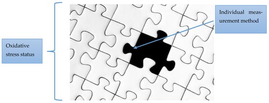 A piece of the puzzle as a single measurement compared to the whole puzzle representing the state of oxidative stress in biological systems. Each piece of the puzzle has its own role and value, but its purpose and meaning only become clear when it is connected to other pieces. Together, these pieces form a complete picture that illustrates how individual components contribute to a unified outcome.