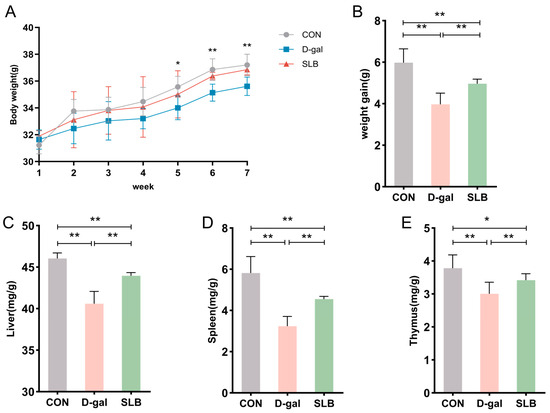 3.1. Effects of Silibinin on Body Weight and Organ Index in Mice with D-Galactose Oxidative Damage