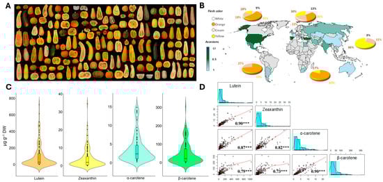 3.1. Phenotypic Variation, Frequency Distribution, and Correlation Analysis of Carotenoid Content