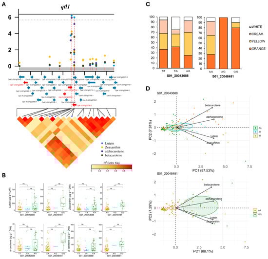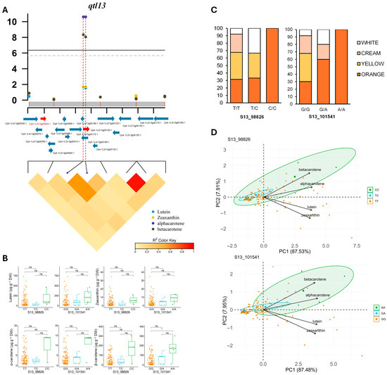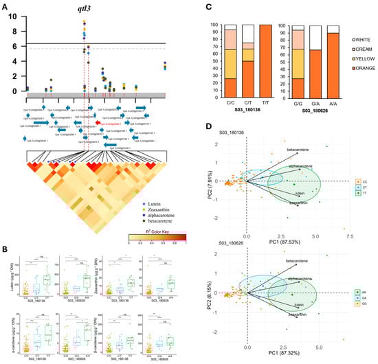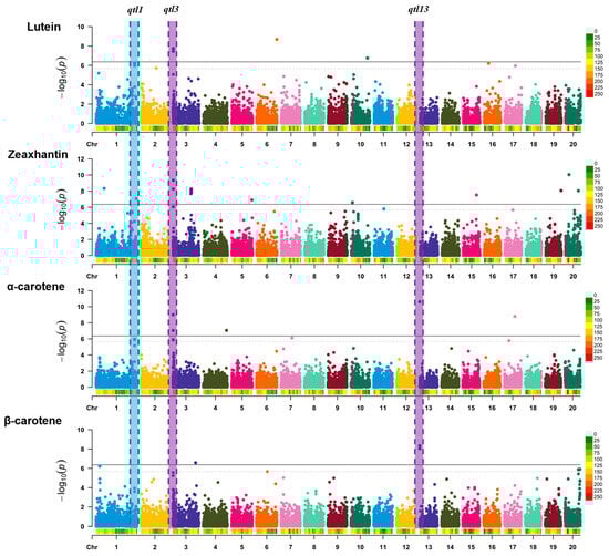 3.3. Genome-Wide Association Study of Carotenoid Content