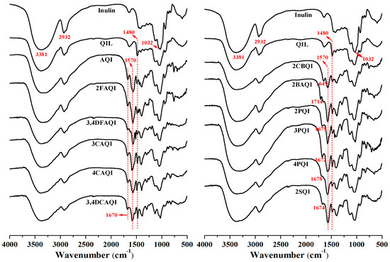FTIR is a convenient and fast technique to observe the structural transformations that occur in a reaction. As shown in Figure 1, native inulin exhibited typical characteristic peaks of polysaccharide of O-H stretching vibration at 3381 cm−1, C-H stretching vibration at 2932 cm−1, and C-O-C stretching vibration at 1032 cm−1 [30]. After cationization, a sharp and strong peak appeared in the spectrum of QIL at 1480 cm−1, which was ascribed to the C-H symmetric bending of the trimethyl groups on the quaternary ammonium [20]. Additionally, a new peak at 1417 cm−1 was associated with the C-N stretching vibration. The data above indicated the successful synthesis of QIL. For the 12 kinds of QIL derivatives, the C-H symmetric bending of the trimethyl groups on the quaternary ammonium at 1480 cm−1 still existed. Additionally, new peaks appeared at around 1670 cm−1 and 1570 cm−1, corresponding to amide I and amide II absorption, respectively. These results provided evidence of the successful derivatization of QIL with aromatic amide.