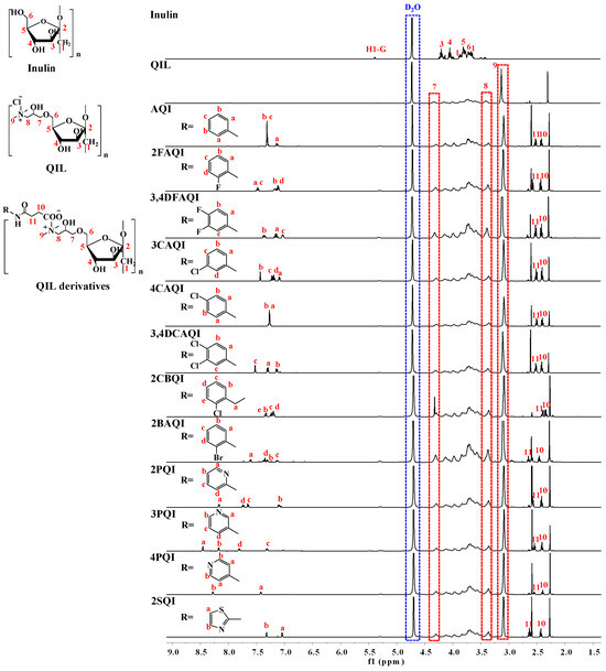 1H NMR spectra of inulin, QIL, and QIL derivatives, taking D2O as the solvent.