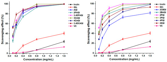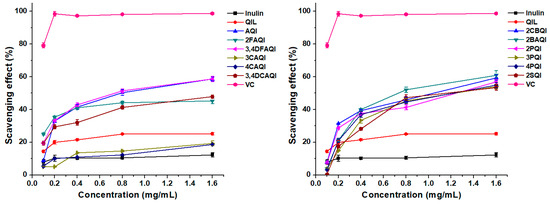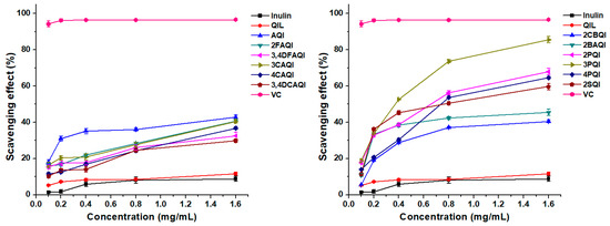 Figure 6 illustrates the superoxide radical scavenging activities of test samples. The positive control VC exhibited a strong ability to scavenge superoxide radicals, which could be completely eliminated even at low test concentrations. The scavenging ability of inulin was the weakest among all the samples, whose scavenging rate was only 12.29% at 1.6 mg/mL. After quaternization, the scavenging ability increased by about 10%. However, when aromatic amide was introduced to QIL, the scavenging abilities of 3CAQI and 4CAQI were reduced compared to QIL. On the contrary, other derivatives including AQI, 2FAQI, 3,4DFAQI, 3,4DCAQI, 2CBQI, 2BAQI, 2PQI, 3PQI, 4PQI, and 2SQI had notably improved scavenging abilities after ion exchange. Among them, 2BAQI had the strongest scavenging rate of 60.93%.