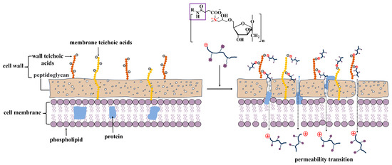 Through further analysis, it was found that derivatives have a more significant inhibitory effect on Gram-positive bacteria, Staphylococcus aureus. The possible mechanism was shown in Figure 7. The Gram-positive bacteria contain wall teichoic and membrane teichoic acids negatively charged [46], which could establish interactions with the positive charges of quaternary ammonium salt. This leads to a large accumulation of quaternary ammonium salts on the surface of bacteria, which disrupts the cell wall structure, causing the leakage of intracellular substances and ultimately leading to bacterial death. In addition, the quaternary ammonium salts in the QIL derivatives serve as a bridge, attracting more amounts of aromatic amide to interact with the bacterial surface, thereby improving the antibacterial effect.