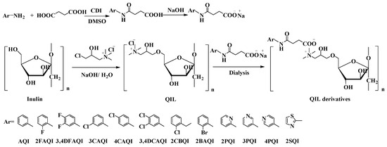 In the synthesis process, QIL was first synthesized by the etherification of free hydroxyl groups of inulin with CHPTAC. It is a cationic polymer with positive charges that can electrostatically interact with anionic compounds. On the other hand, amine was first reacted with succinic acid under the catalytic action of carbonyldiimidazole (CDI). Subsequently, the unreacted carboxylic groups were treated with NaOH to convert them into their ionic form, which then underwent an ion exchange reaction with QIL inside the dialysis bag. The unreacted ions were removed through the dialysis bag to obtain the final products.