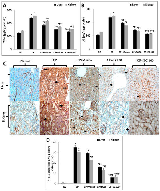 Effect of EG pretreatment on liver and kidney levels of pro-inflammatory markers (TNF-α (A), IL-6 (B)), IHC expression of NF-κB (×400, black arrows represent localization of positively stained brown nuclei with faint ignored background staining) (C) and semi-quantitative estimation of NF-κB positively stained nuclei in hepatic and renal tissues of CP-treated mice.