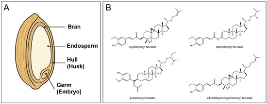 Schematic representation of rice grain structure (A), and chemical structure of the main γ-oryzanol components present in rice bran (B).