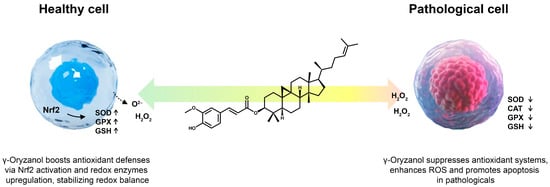 Due to these environment-dependent, bidirectional roles, γ-oryzanol can act as a disease-modifying agent, promoting cell survival and redox stability in healthy or inflamed tissues but fostering ROS accumulation and enhancing cell death in pathological environments such as cancer or chronic oxidative injury (Figure 3). This duality highlights γ-oryzanol’s potential for targeted therapeutic strategies, either to sensitize malignant cells to oxidative damage or to protect vulnerable tissues from redox imbalance and inflammation.