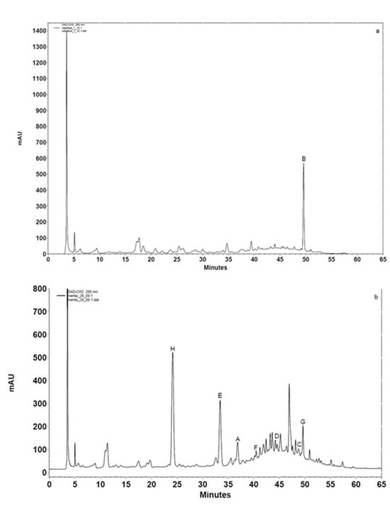 The natural phenolic compounds were identified in plant extracts using HPLC coupled with a Diode Array Detector (HPLC-DAD) (VWR® Hitachi Elite LaChrom system, VWR, Darmstadt, Germany). The chromatographic separation was carried out using a column that retains hydrophobic molecules—SVEA C18 with dimensions 150 mm × 4.6 mm and 5 μm particle size (Nanologica, Stockholm, Sweden)—under a gradient elution system. The column operated using a constant flow rate of 0.5 mL/min at 30 °C. The mobile phase consisted of three solvent systems: A) water containing 1% formic acid, B) methanol containing 1% formic acid, and C) acetonitrile containing 1% formic acid. The column running program was applied as follow: 90% A, 6% B, 4% C from 0 to 5 min, adjusted to 85% A, 9% B and 6% C from 5 to 30 min, between 30 and 60 min the composition changed to 71% A, 17.4% B and 11.6% C, 0% A, 85% B and 15% C from 60 to 63 min. Finally, between 63 and 65 min, the system was re-equilibrated to 90% A, 6% B, and 4% C [12]. A volume of 20 μL was used for injection, and the detection was conducted at a wavelength of 280 nm—a wavelength frequently used for the analysis of phenolic compounds due to their strong absorbance in this region. The identification of the bioactive compounds in the extracts was carried out using their retention times and λmax (qualitative analysis) and the construction of standard calibration curves (quantitative determination).