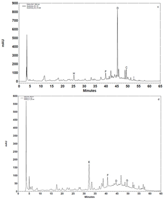 Chromatographic analysis of four aromatic natural herbs: (a) Ocimum basilicum L., (b) Mentha piperita L., (c) Mentha spicata L., and (d) Aloysia citrodora. In the panels, the peak of the spectrum of each compound is mentioned: (A) ferulic acid, (B) naringenin, (C) quercetin, (D) rosmarinic acid, (E) coumaric acid, (F) rutin, (G) luteolin, (H) caffeic acid and (I) kaempferol, and the respective retention time is depicted.