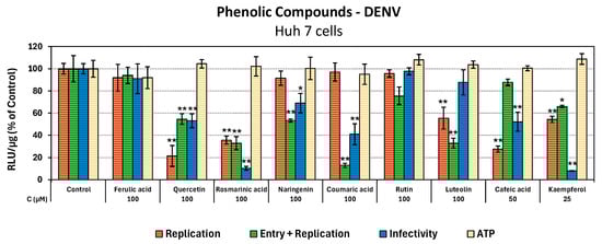 To screen the plant polyphenols against DENV, we used cell culture-produced viral stocks of the full-length reporter DENV (DVR2A) that co-expresses the Renilla luciferase (R-Luc) gene. As the expression of R-Luc is linked with the expression of viral proteins, the activity of R-Luc is representative of the viral replication. The aim was to study the effect of the compounds on the virus life cycle and specifically on the stages of viral entry, genome replication, and released infectivity, which may be potential targets. For this purpose, Huh7 cells, preincubated or not with the compounds, were infected with DVR2A at MOI = 0.01 pfu/cell, in the presence or absence of the corresponding compound. The compounds were used in non-cytotoxic concentrations, based on their respective CC50 values (Table 2).