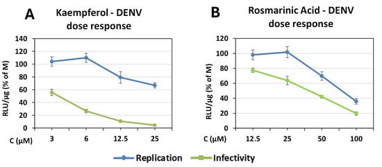 Due to the superior efficacy of kaempferol in inhibiting both DENV genome replication and released infectivity, as well as the antiviral activity of rosmarinic acid against both of these stages of the viral life cycle, we generated dose–response curves to characterize their antiviral activity in greater detail (Figure 3). Based on EC50 values shown above, we selected for kaempferol the concentrations of 25, 12.5, 6, and 3 μM to be depicted, while for rosmarinic acid, the concentrations of 100, 50, 25, and 12.5 μM were shown.