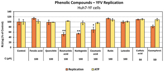 To investigate whether the studied polyphenols exhibit broad-spectrum antiviral activity against the Flavivirus genus, we also evaluated their efficacy against Yellow Fever Virus (YFV). In order to evaluate the compounds for their antiviral activity against YFV, the Huh7-YF cell line was employed, which expresses the subgenomic replicon of YFV-17D. Initially, the cells were subjected to incubation with the compounds at serial concentrations for 72 h. The quantification of viral replication was assessed by measuring Renilla luciferase activity, which is co-expressed with the viral replicon and corresponds to the levels of viral replication. The EC50 values and their respective SI were calculated and presented in Table 4. As shown in Figure 4, most compounds did not exhibit any effect against YFV replication, except for rosmarinic acid and naringenin, which showed a slight effect with EC50 values estimated at 98.03 μΜ and 101.70 μΜ, respectively (Table 4).