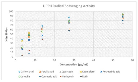 The IC50 values of the compounds, caffeic acid, ferulic acid, quercetin, kaempferol, rosmarinic acid, luteolin, coumaric acid, naringenin, and rutin were 6.37, 10.14, 8.05, 7.40, 12.28, 9.48, 21.17, 17.45, and 21.86 μg/mL, respectively (Table 5, Figure 5). These results indicate that caffeic acid exhibited the strongest antioxidant activity among the tested polyphenols, with the remaining compounds displaying progressively lower activity in the following order: kaempferol, quercetin, luteolin, ferulic acid, rosmarinic acid, naringenin, coumaric acid, and rutin. Caffeic acid and kaempferol exhibit the highest antioxidant activity, thereby suggesting a potential mechanism by which they inhibit DENV replication through the mitigation of oxidative stress essential for viral propagation [15]. Nevertheless, no appreciable differences were observed between the majority of the samples. Within the group of the examined compounds, rutin exhibited the weakest antioxidant activity, reflected by its highest IC50 value (21.86 μg/mL).