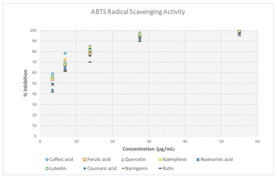 Thus, the results of the ABTS assay are in agreement with those of the DPPH method, concerning the order of the antioxidant potential of the tested compounds, as the strongest activity was observed in the case of caffeic acid, followed by that of kaemferol, quercetin, luteolin, ferulic acid, rosmarinic acid, naringenin, coumaric acid, and finally of rutin.