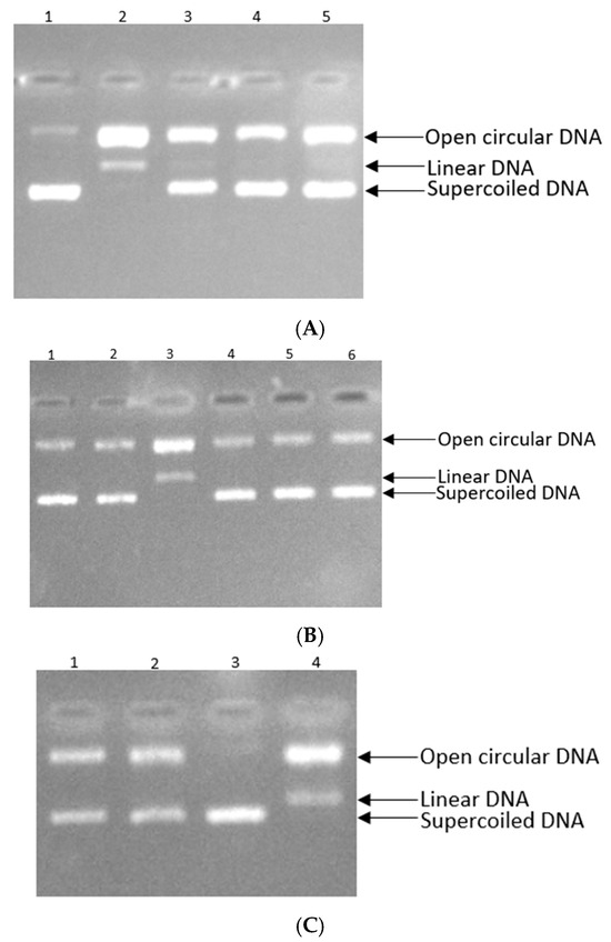 (A) Inhibitory effect of natural compounds on pBR322 plasmid DNA damage. Lane 1: control, Lane 2: blank, Lane 3: plasmid DNA + 30 mM AAPH + 8.05 μg/mL (IC50) of quercetin, Lane 4: plasmid DNA + 30 mM AAPH + 7.40 μg/mL (IC50) of kaempferol, Lane 5: plasmid DNA + 30 mM AAPH + 6.37 μg/mL (IC50) of caffeic acid. (B) Inhibitory effect of natural compounds on pBR322 plasmid DNA damage. Lane 1: plasmid DNA + 30 mM AAPH + 12.28 μg/mL (IC50) of rosmarinic acid, Lane 2: plasmid DNA + 30 mM AAPH + 17.45 μg/mL (IC50) of naringenin, Lane 3: blank, Lane 4: control, Lane 5: plasmid DNA + 30 mM AAPH + 9.48 μg/mL (IC50) of luteolin, Lane 6: plasmid DNA + 30 mM AAPH + 10.14 μg/mL (IC50) of ferulic acid. (C) Inhibitory effect of natural compounds on pBR322 plasmid DNA damage. Lane 1: plasmid DNA + 30 mM AAPH + 21.17 μg/mL (IC50) of coumaric acid, Lane 2: plasmid DNA + 30 mM AAPH + 21.86 μg/mL (IC50) of rutin, Lane 3: control, Lane 4: blank.