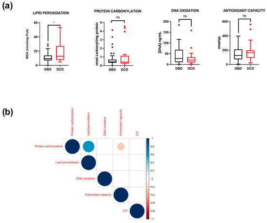 DCD livers exhibit increased oxidative damage: (a) Concentration of oxidative biomolecules in eiOPS from 74 explanted livers. Results are presented as medians, interquartile ranges, and minimum and maximum values. ns = not significant; * p ≤ 0.05. Data are presented as interquartile range and median. Outliers are shown as individual points. (b) Correlation matrix between cold ischemia time (CIT) and the concentration of oxidative biomolecules and total antioxidant capacity within eiOPS.