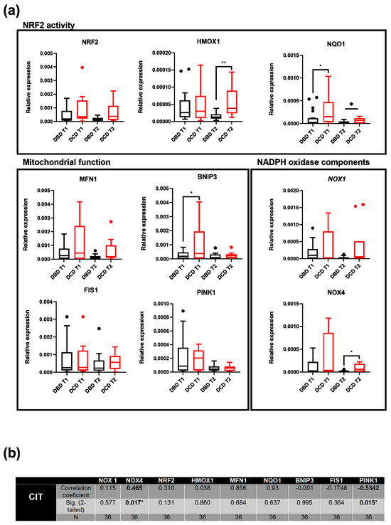 Transcriptomic analysis of oxidative stress-related genes: (a) Comparison of gene expression, as determined by qRT-PCR, between tissue biopsies obtained before liver procurement (T1) and after static cold ischemic storage (T2) in 36 donated livers, and categorized by donation type. * p ≤ 0.05; ** p ≤ 0.01. Data are presented as interquartile range and median. Outliers are shown as individual points. (b) Correlation matrix between CTI and the expression of different oxidative stress-related genes in T2 liver tissue samples.