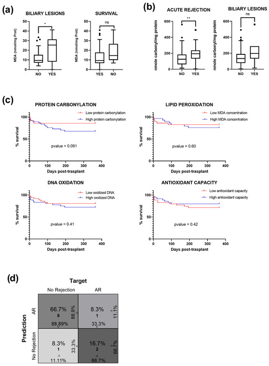 Patients developing pathology after transplantation experience larger oxidative damage: (a) Concentration of MDA quantified in eiOPS from 74 explanted livers, comparing individuals with and without biliary lesions, as well as patients who do or do not survive within the first year post-transplantation. Data are presented as interquartile range and median. Outliers are shown as individual points. (b) Concentration of protein carbonylation, comparing occurrence of acute rejection and biliary lesions in 74 patients. ns = not significant; * p ≤ 0.05; ** p ≤ 0.01. (c) Kaplan–Meier survival curves displaying the probability of survival for two different groups of patients sorted by the median concentration of each oxidized biomolecule and total antioxidant capacity. (d) Confusion matrix estimated from the predictive logistic model. The percentages on the horizontal axes of the first and fourth cells represent specificity and sensitivity, while the vertical axes show positive and negative predictive values, respectively. The relative percentages and counts for each cell are displayed at the center.