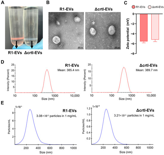 EVs were successfully isolated from the culture supernatants of both wild-type D. radiodurans (R1) and the DX-deficient mutant (ΔcrtI-EVs) using a combination of differential centrifugation, TFF, and density gradient ultracentrifugation. The isolation procedure was conducted in accordance with the Minimal Information for Studies of EVs (MISEV) guidelines [27], and the resulting EVs were subjected to comprehensive physicochemical characterization. EVs were isolated from wild-type and ΔcrtI (DX-deficient) strains. During density-gradient purification, the R1-EV fraction displayed a characteristic pink hue, consistent with the DX pigmentation in the source strain, whereas the ΔcrtI-EV fraction was essentially colorless (Figure 1A). The TEM images showed that both EV types exhibited typical spherical (Figure 1B). Zeta potential measurements showed slightly negative surface charges for both EV populations, with no statistically significant difference between them (Figure 1C). DLS analysis revealed that the hydrodynamic diameters of R1-EVs and ΔcrtI-EVs were comparable, averaging 385.4 nm and 389.7 nm, respectively (Figure 1D). The NTA confirmed similar particle concentrations for both EV types, with 3.08 × 1011 particles/mL for R1-EVs and 3.21 × 1011 particles/mL for ΔcrtI-EVs in 1 mg/mL protein preparations (Figure 1E). The comparable morphology and physicochemical properties of R1-EVs and ΔcrtI-EVs indicate that deletion of dr0861 does not significantly affect the basic biophysical characteristics of the EVs, supporting their use in subsequent immunological assays. Consistent with the DX enrichment, R1-EVs exhibited significantly higher antioxidant activity than ΔcrtI-EVs across multiple assays, including DPPH, ABTS, SOD, and CAT (Supplementary Figure S1).