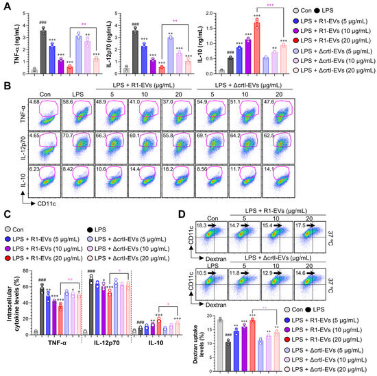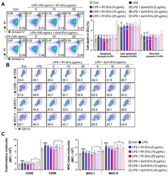 The bone marrow cells were flushed from the femurs and tibias of the C57BL/6 mice and treated with a red blood cell lysis buffer (Sigma–Aldrich). The remaining cells were cultured in the RPMI-1640 medium (Biowest, Nuaillé, France), supplemented with a 10% heat-inactivated fetal bovine serum (FBS), a 1% penicillin/streptomycin (P/S, Gibco, Carlsbad, CA, USA), a 20 ng/mL GM-CSF, and a 0.5 ng/mL IL-4 for eight days to generate the BMDCs. After differentiation, the cells were harvested and confirmed to contain > 90% CD11c+ cells by flow cytometry (FACSVerse, BD Bioscience) using an anti-CD11c antibody. After differentiation, the BMDCs (0.5 × 106 cells/well in a 48-well plate) were incubated for 18 h under the following four conditions: untreated, the LPS alone (100 ng/mL), the LPS plus R1-EVs (5, 10, or 20 μg/mL), or the LPS plus ΔcrtI-EVs (same doses). The cells were cultured at 37 °C in a 5% CO2 incubator and analyzed for maturation markers or cytokine production as indicated.