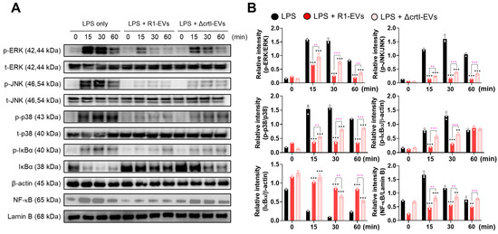 The BMDCs were treated with one of the following: LPS alone (100 ng/mL), LPS plus R1-EVs (20 μg/mL), or LPS plus ΔcrtI-EVs (20 μg/mL). The cells were harvested at the indicated time points (0, 15, 30, and 60 min) after stimulation. The cytosolic and nuclear protein fractions were isolated using an RIPA buffer (Pierce, Rockford, IL, USA) and the CelLytic NuCLEAR Extraction Kit (Sigma–Aldrich), respectively, according to the manufacturer’s instructions. Western blotting was performed as previously described [26].