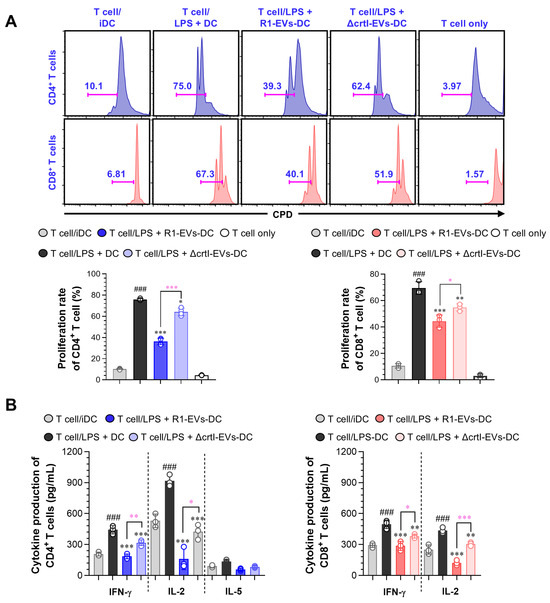 The R1-EVs-treated BMDCs displayed anti-inflammatory activity by changing to a tolerogenic phenotype in response to LPS stimulation. The DCs bridge innate and adaptive immunity by presenting antigens, co-stimulatory molecule interaction, and secreting cytokines that guide T cell activation and differentiation [38]. IL-10–producing tolerogenic DCs are known to suppress the T cell proliferation by limiting co-stimulatory and inflammatory signals [39,40]. We therefore evaluated whether R1-EV–treated BMDCs could regulate allogeneic T cell responses in a mixed lymphocyte reaction assay. The BMDCs were pretreated with LPS (100 ng/mL) alone or in combination, and subsequently co-cultured with allogeneic CD4+ and CD8+ T cells labeled with a cell proliferation dye (CPD) eFluor 450. T cells co-cultured with BMDCs treated with LPS alone exhibited robust proliferation, while those co-cultured with R1-EV/LPS–treated BMDCs showed markedly reduced proliferation of both CD4+ and CD8+ T cells. Notably, this effect was diminished when BMDCs were treated with ΔcrtI-EVs and LPS, indicating that the presence of DX in R1-EVs contributes to their immunomodulatory function (Figure 5A). To further evaluate the functional consequence of suppressed the T cell proliferation, we measured cytokine production in the culture supernatants. Levels of Th1 (IFN-γ, IL-2) and Th2 (IL-5) cytokines were elevated in T cells co-cultured with LPS-stimulated BMDCs, while the secretion of these cytokines was significantly attenuated in the R1-EV/LPS group (Figure 5. Consistent with these findings, the ΔcrtI-EVs-EV/LPS group exhibited reduced suppressive capacity compared to the R1-EV/LPS group. Together, these data suggest that R1-EVs attenuate the capacity of the LPS-stimulated BMDCs to activate allogeneic T cells, highlighting the pivotal role of DX in modulating the DC–T cell interactions under inflammatory conditions.
