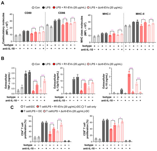 Given that IL-10 is a central negative regulator of DC activation and tissue inflammation [41], we tested its requirement for the tolerogenic activity of R1-EVs by performing neutralization experiments with an anti-IL-10 monoclonal antibody. The BMDCs were pretreated with anti-IL-10 or rat IgG1 isotype control for 2 h prior to stimulation with LPS combined with either R1-EVs or ΔcrtI-EVs. Neutralization of IL-10 significantly restored the surface expression of CD80, CD86, MHC-I and MHC-II in BMDCs compared to isotype-treated controls (Figure 6A), indicating reversal of the maturation-suppressive effect by R1-EVs. Consistently, IL-10 neutralization abolished the R1-EV–mediated suppression of TNF-α and IL-12p70 and reduced extracellular IL-10 to near-baseline levels, confirming effective blockade (Figure 6B). We next assessed whether IL-10 is also required for the suppression of T cell activation by R1-EV–treated BMDCs. In allogeneic mixed lymphocyte reactions, the proliferation of both CD4+ and CD8+ T cells was significantly restored when co-cultured with IL-10–neutralized BMDCs treated with LPS + R1-EVs or LPS + ΔcrtI-EVs (Figure 6C). These results collectively demonstrate that IL-10 is essential for the induction of the tolerogenic phenotype by R1-EVs, affecting DC maturation, pro-inflammatory cytokine production, and downstream T cell responses.