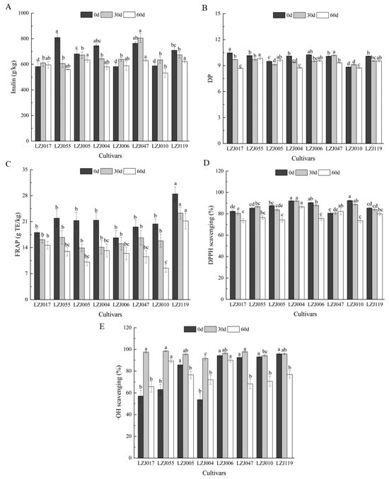 Changes in inulin content (A), DP (B), FRAP (C), DPPH scavenging ability (D) and •OH scavenging activity (E) in different varieties Jerusalem artichoke tubers during storage. Data are presented as mean ± SE (n = 3). Data with different letters are significantly different (p < 0.05).