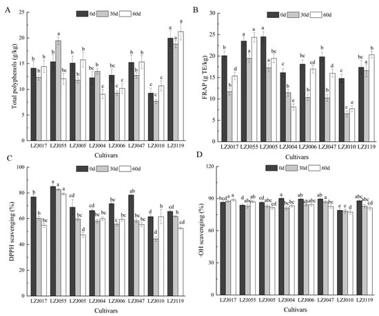 Changes in total polyphenol (A), FRAP (B), DPPH scavenging ability (C) and •OH scavenging activity (D) in different varieties Jerusalem artichoke tubers during storage. Data are presented as mean ± SE (n = 3). Data with different letters are significantly different (p < 0.05).