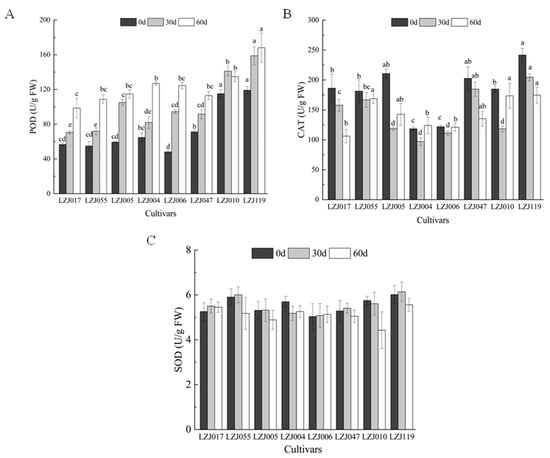 POD activity showed significant variations across all eight cultivars during cold storage (Figure 3A, Supplementary Table S3). Statistical analysis revealed significant differences in the magnitude of POD activity changes among cultivars (p < 0.05). LZJ119 exhibited the highest POD activity, followed closely by LZJ010, while LZJ017 recorded the lowest. In contrast, CAT activity showed a more variable pattern (Figure 3B). In cultivars LZJ017, LZJ047, and LZJ119, CAT activity steadily decreased throughout the storage period. However, in LZJ055, LZJ005, LZJ004, LZJ006, and LZJ010, CAT activity showed a V-shaped pattern, with a significant decline during the first 30 days of storage (p < 0.05), followed by an increase towards the end of the storage period. Among all cultivars, CAT activity was significantly higher in LZJ047 and LZJ119, while it was lower in LZJ004 and LZJ006. As for SOD activity (Figure 3C), there were no significant differences among the cultivars at most time points (p > 0.05). Generally, SOD activity increased initially and then declined, with the exception of LZJ004, LZJ006, and LZJ010, which showed different patterns, though these differences were not always statistically significant.