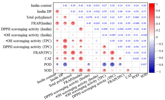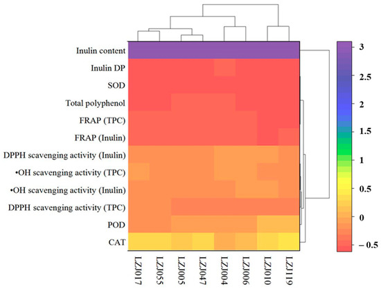In addition, DP was positively correlated with TPC, FRAP of inulin, •OH scavenging activity, DPPH scavenging activity, and CAT (p < 0.01), indicating that the degree of inulin polymerization significantly enhances the antioxidant potential of the tubers. These correlations suggest that more polymerized inulin can stabilize cell structures and maintain osmotic balance under oxidative stress conditions, indirectly supporting polyphenols and antioxidant enzymes in scavenging free radicals.