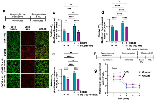 The reaction of COX and Cytc is the proposed rate-limiting step of the ETC and thus regulates ΔΨm, and their activation contributes to ΔΨm hyperpolarization during early reperfusion. To measure relative changes in ΔΨm, the ratio-metric probe JC10 was used, which, as a monomer, emits green fluorescence and, at high ΔΨm, influxes into the mitochondria, causing it to aggregate and emit red fluorescence. Relative changes in ΔΨm can be quantified by the red-to-green fluorescence ratio. To simulate early reperfusion conditions, cells underwent 90 min of OGD followed by 30 min of reoxygenation with or without IRL (Figure 3a). We evaluated inhibitory IRL wavelengths individually (750 or 950 nm) and in combination (750 + 950 nm). Representative fluorescent images showed increased red fluorescence of JC10 in cells subjected to OGD without IRL treatment, indicating ΔΨm hyperpolarization. In contrast, cells that received the combination treatment (750 + 950 nm) exhibited fluorescent intensity similar to the control group (Figure 3b). Quantification of red-to-green fluorescence ratio confirmed that cells treated with individual IRL wavelengths or their combination following OGD, resulted in ΔΨm comparable to control levels (Figure 3c–e). As expected, control cells exposed only to IRL but did not undergo OGD/R, showed a decrease of ΔΨm, mediated by the COX-inhibitory effect under basal conditions.