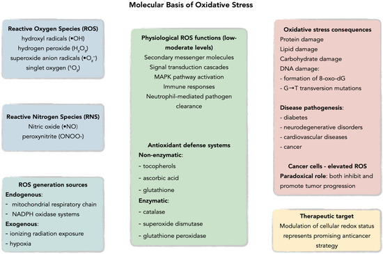 Under physiological conditions, ROS are maintained at appropriate levels by endogenous antioxidant defenses comprising non-enzymatic antioxidants such as tocopherols, ascorbic acid, and glutathione, alongside antioxidant enzymes including catalase, superoxide dismutase, and glutathione peroxidase, with brain tissue demonstrating particularly robust antioxidant systems due to its high metabolic rate and susceptibility to oxidative damage [20,21,24,25,26,27,28,29,30,31,32,33,34]. ROS generation occurs through both endogenous pathways, primarily via the mitochondrial respiratory chain and NADPH oxidase systems, and exogenous processes including ionizing radiation exposure [20,23,25,30,32,35,36,37,38]. At low to moderate concentrations, ROS function as secondary messenger molecules in signal transduction cascades, activating the mitogen-activated protein kinase (MAPK) family pathways and promoting physiological processes such as immune responses through neutrophil-mediated pathogen clearance [30,33,34,39,40,41,42,43]. Specifically, H2O2 can activate p38 MAPK and JNK pathways in macrophages by oxidatively modifying upstream kinases and inhibiting MAPK phosphatases, leading to nuclear factor-κB (NF-κB) activation and subsequent pro-inflammatory cytokine production—a crucial mechanism in innate immune responses [44,45]. However, when oxidative balance is disrupted, excessive ROS production leads to oxidative stress, resulting in cellular damage through DNA mutations, particularly the formation of 8-oxo-7,8-dihydro-2′-deoxyguanosine (8-oxo-dG) which promotes G→T transversion mutations [23,33,46,47,48,49,50,51]. This oxidative dysregulation has been implicated in the pathogenesis of multiple human diseases including diabetes, cancer, neurodegenerative disorders, and cardiovascular diseases [32,46,47,52,53,54,55,56]. Cancer cells exhibit particularly elevated ROS levels due to aberrant signaling pathways that paradoxically both inhibit and promote tumor progression, suggesting that therapeutic modulation of cellular redox status represents a promising avenue for anticancer strategies [32,46,47,57]. Glioblastoma cells demonstrate a distinct ROS profile characterized by elevated NADPH oxidase 4 (Nox4) expression, which drives both tumor invasion and angiogenesis, setting them apart from other solid tumors where different ROS-generating systems predominate [58,59].