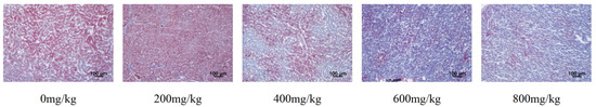 The HE-stained liver sections exhibited extensive fat deposition in the control, 200 mg/kg, and 400 mg/kg groups, whereas treatment with 600 mg/kg and 800 mg/kg marigold extract considerably reduced hepatic fat accumulation (Figure 2). These findings indicate that optimal marigold extract supplementation alleviated liver steatosis in laying hens.