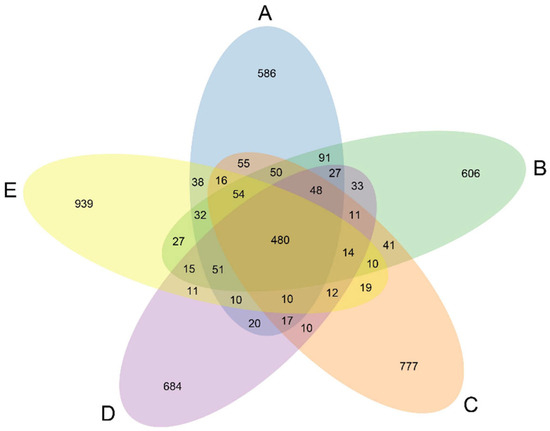 Venn diagram based on Operational Taxonomic Unit (OTU) classification. Each circle represents a group, and the number of circles and the overlapping part of the circle represent the number of. OTUs are common between the groups, and the number without overlap represents the number of OTUs unique to the group. (A) Control group, (B) 200 mg/kg marigold extract group, (C) 400 mg/kg marigold extract group, (D) 600 mg/kg marigold extract group, and (E) 800 mg/kg marigold extract group.
