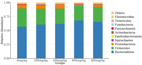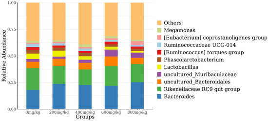 The 10 most abundant species at the phylum level were selected to generate a stacked histogram, while the other phyla were referred to as “others” (Figure 4). Among the phyla, Bacteroidetes, Firmicutes, and Proteobacteria had the highest relative abundances. The abundance of Bacteroidetes showed a quadratic curve with increasing marigold extract. Figure 5 displays the top 10 most abundant genera, with Bacteroidales, Rikenellaceae_RC9_gut_group, and uncultured_Bacteroidales being the predominant species.