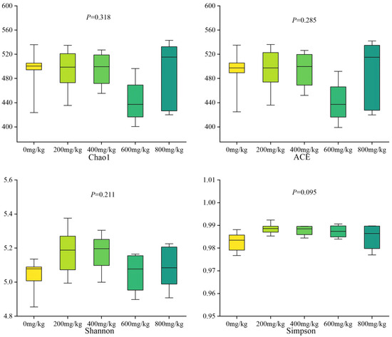 At the 24th week, the laying hens from which blood was collected were slaughtered, the cecum was removed, and the cecal chow was extruded, collected in EP tubes, and frozen at −80 °C for testing. Cecal microbial 16S rRNA analysis, including species relative abundance, microbial α diversity, and PCOA analysis, was performed by Rhonin Biosciences (Chengdu, China).