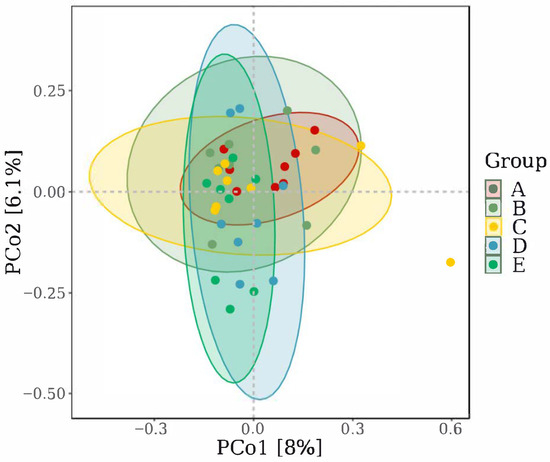All groups shared 480 OTUs, but unique OTUs progressively increased across Groups A–E as the concentration of the marigold extract increased (Figure 3), indicating that the addition of marigold extract modulates the composition of the gut microbiota.