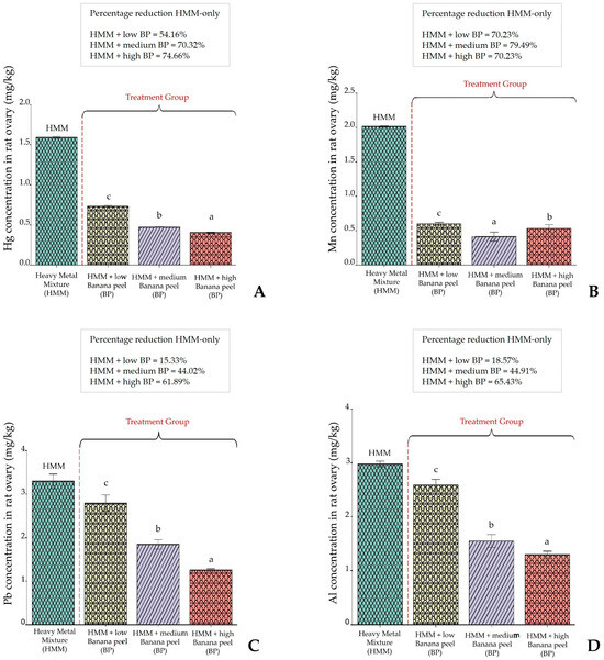 (A–D) Effect of banana peel (BP) extract on ovarian accumulation of heavy metals in rats co-exposed to a heavy metal mixture (HMM). (A) Hg concentration, (B) Mn concentration, (C) Pb concentration, (D) Al concentration. Data are presented as mean ± SD (n = 10). Statistical analysis was performed using one-way ANOVA followed by Duncan’s multiple range test. Bars with different letter notations (a–c) differ significantly at p < 0.05. Exact p-values for the main comparisons are as follows: Panel (A) (Hg): HMM vs. HMM + low BP, p = 0.031; HMM vs. HMM + medium BP, p = 0.008; HMM vs. HMM + high BP, p = 0.002. Panel (B) (Mn): HMM vs. HMM + low BP, p = 0.045; HMM vs. HMM + medium BP, p = 0.006; HMM vs. HMM + high BP, p = 0.012. Panel (C) (Pb): HMM vs. HMM + low BP, p = 0.027; HMM vs. HMM + medium BP, p = 0.004; HMM vs. HMM + high BP, p = 0.001. Panel (D) (Al): HMM vs. HMM + low BP, p = 0.039; HMM vs. HMM + medium BP, p = 0.009; HMM vs. HMM + high BP, p = 0.003.