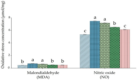 HMM + high banana peel (BP). Values are mean ± SD, n = 10. Bars with the same letter notations (a, b, c) are not significantly different from each other (p ≥ 0.05). Exact p-values for the main pairwise comparisons: MDA, HMM vs. HMM + low BP, p = 0.042; HMM vs. HMM + medium BP, p = 0.011; HMM vs. HMM + high BP, p = 0.006; NO, HMM vs. HMM + low BP, p = 0.027; HMM vs. HMM + medium BP, p = 0.004; HMM vs. HMM + high BP, p = 0.001.