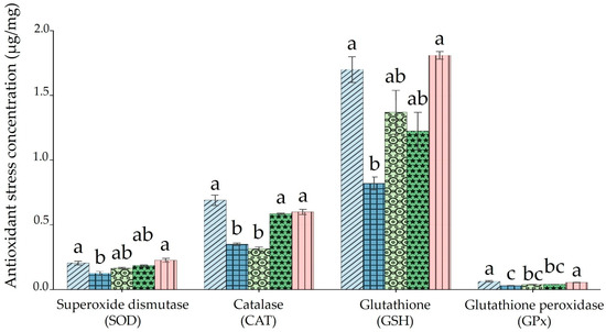 Superoxide dismutase (SOD) activity was significantly lower in the HMM-only group compared to the control group (Figure 3, SOD). The low- and medium-dose BP groups showed intermediate values, not significantly different from either the control or the HMM group, indicating partial, non-significant improvement. The high-dose BP group restored SOD activity to control levels and these were significantly higher than those of the HMM-only group. Catalase (CAT) activity was significantly reduced in the HMM-only and in the low-dose BP groups compared to the control (Figure 3, CAT). Medium- and high-dose BP groups had values comparable to the control and significantly higher than those of the HMM group. Glutathione (GSH) levels followed a similar pattern: the HMM-only group had significantly lower levels than those of the control (Figure 3, GSH). Low- and medium-dose BP groups were intermediate and not significantly different from either the control or HMM. The high-dose BP group (letter a) was restored to control levels, which were significantly higher than those of the HMM-only group. Glutathione peroxidase (GPx) activity was lowest in the HMM-only group (Figure 3, GPx). The values of the control and high-dose BP groups were significantly higher than those of the HMM.