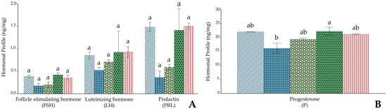 Ovarian concentrations of follicle-stimulating hormone (FSH), luteinizing hormone (LH), prolactin (PRL), and progesterone (P) were quantified using enzyme-linked immunosorbent assay (ELISA) kits (Monobind Inc., Lake Forest, CA, USA; FSH, Cat. No. 425-300 B; LH, Cat. No. 8325-300 E (panel including LH); PRL, Cat. No. 725-300; P, Cat. No. 4825-300 A). The assays were performed according to the manufacturer’s instructions.