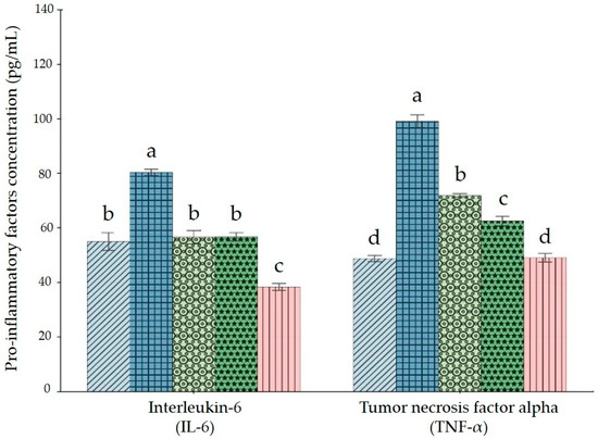 HMM + high banana peel (BP). Values are mean ± SD, n = 10. Bars with the same letter notations (a, b, c, d) are not significantly different from each other (p < 0.05). Exact p-values for the main pairwise comparisons: IL-6: HMM vs. Control, p = 0.018; HMM vs. HMM + low BP, p = 0.027; HMM vs. HMM + medium BP, p = 0.021; HMM vs. HMM + high BP, p = 0.008. TNF-α: HMM vs. Control, p = 0.011; HMM vs. HMM + low BP, p = 0.023; HMM vs. HMM + medium BP, p = 0.015; HMM vs. Hhigh BP, p = 0.004.
