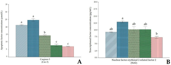 (A,B) Impact of banana peel extract (BP) on (A) apoptotic factor concentration, (B) transcriptional factor concentration in ovary of albino rats exposed for 60 days to a heavy metal mixture (HMM).
