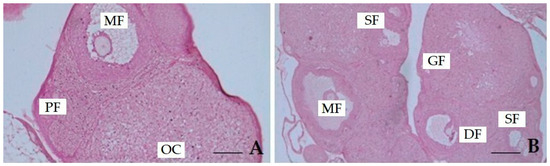 (A,B). Representative photomicrographs of rat ovaries: (A) ovary from the group exposed to heavy metal mixture (HMM), (B) ovary from the group co-treated with medium-dose of banana peel extract (BP) (400 mg/kg). Abbreviations: MF, mature follicle; OC, ovarian cortex/cell deposit; PF, primordial follicles; DF, degenerating follicles; GF, growing follicles; SF, secondary follicles. Scale bar = 100 μm.