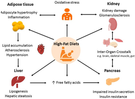 The following section provides an integrative overview of how HFDs influence various organ systems, with a particular emphasis on oxidative stress as a unifying factor and mediator of crosstalk among metabolic, cardiovascular, and renal pathways in the development of CKMS.