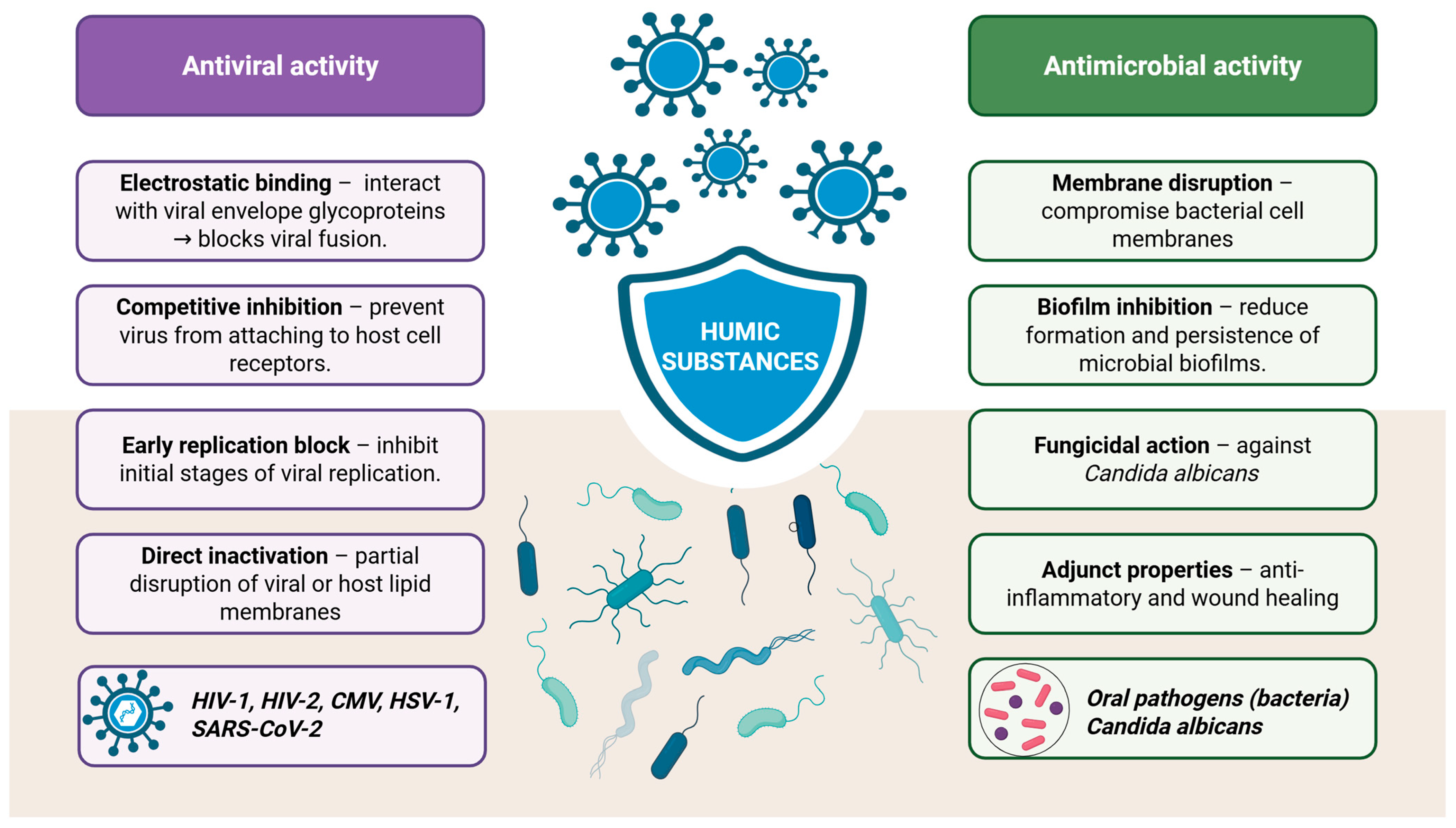 - Socol, D.C. Clinical Review of Humic Acid as an Antiviral: Leadup to Translational Applications in Clinical Humeomics. Front. Pharmacol. 2023, 13, 1018904. [Google Scholar] [CrossRef] [PubMed]